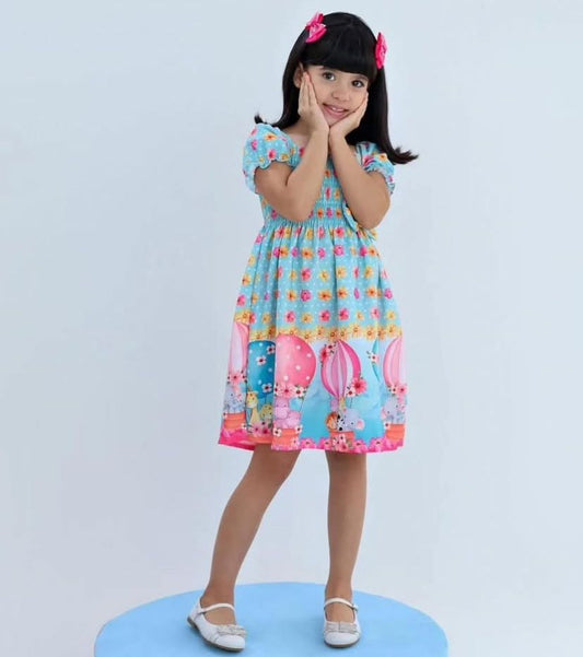 Vestido trapezio azul arco-iris 4 anos