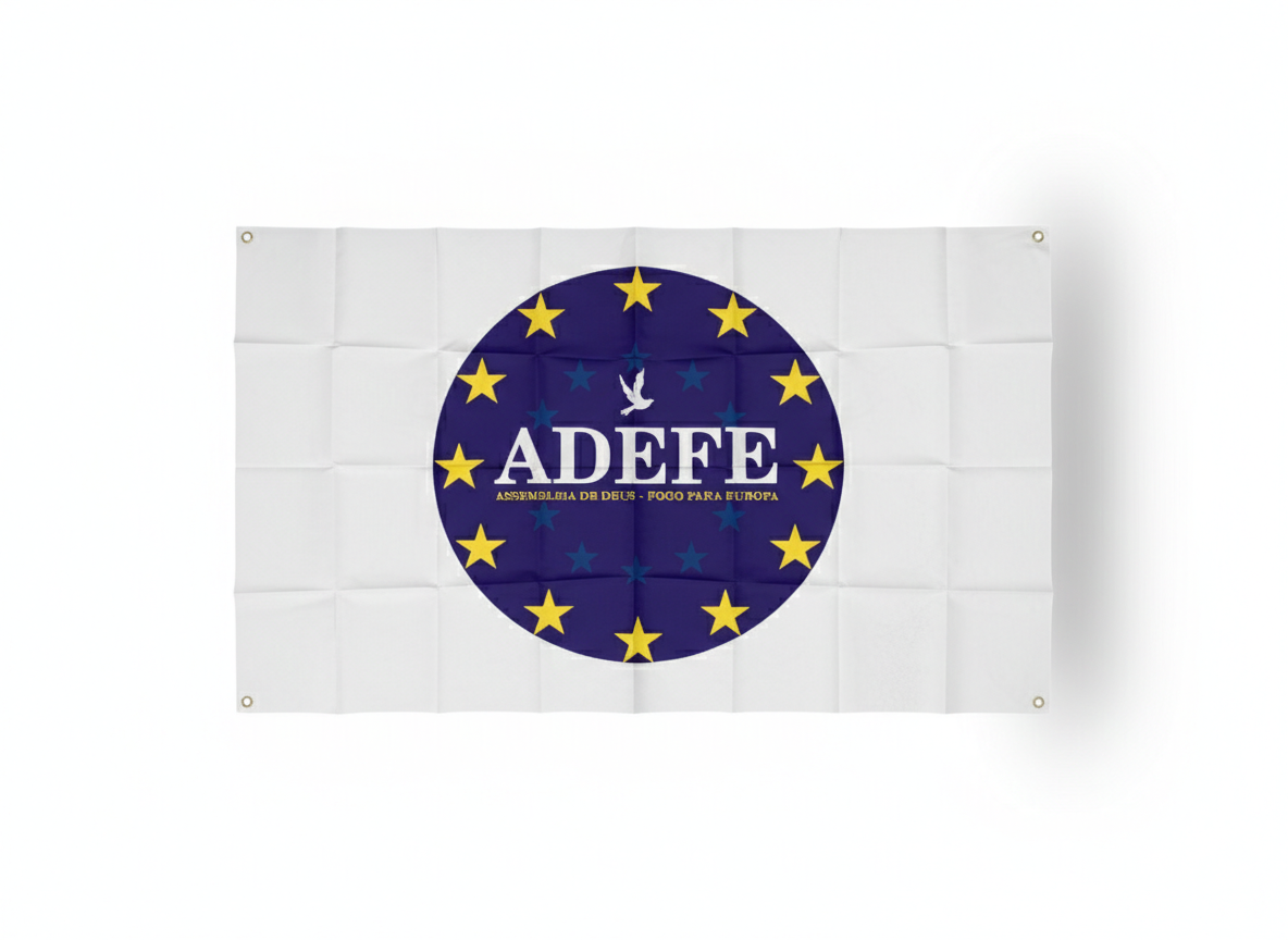 A Bandeira ADEFE apresenta um design contemporâneo e institucional, caracterizado por um fundo branco sólido que transmite clareza e profissionalismo. No centro da composição, destaca-se um emblema circular em azul-marinho profundo, contornado por doze estrelas douradas de cinco pontas, simbolizando unidade e excelência.