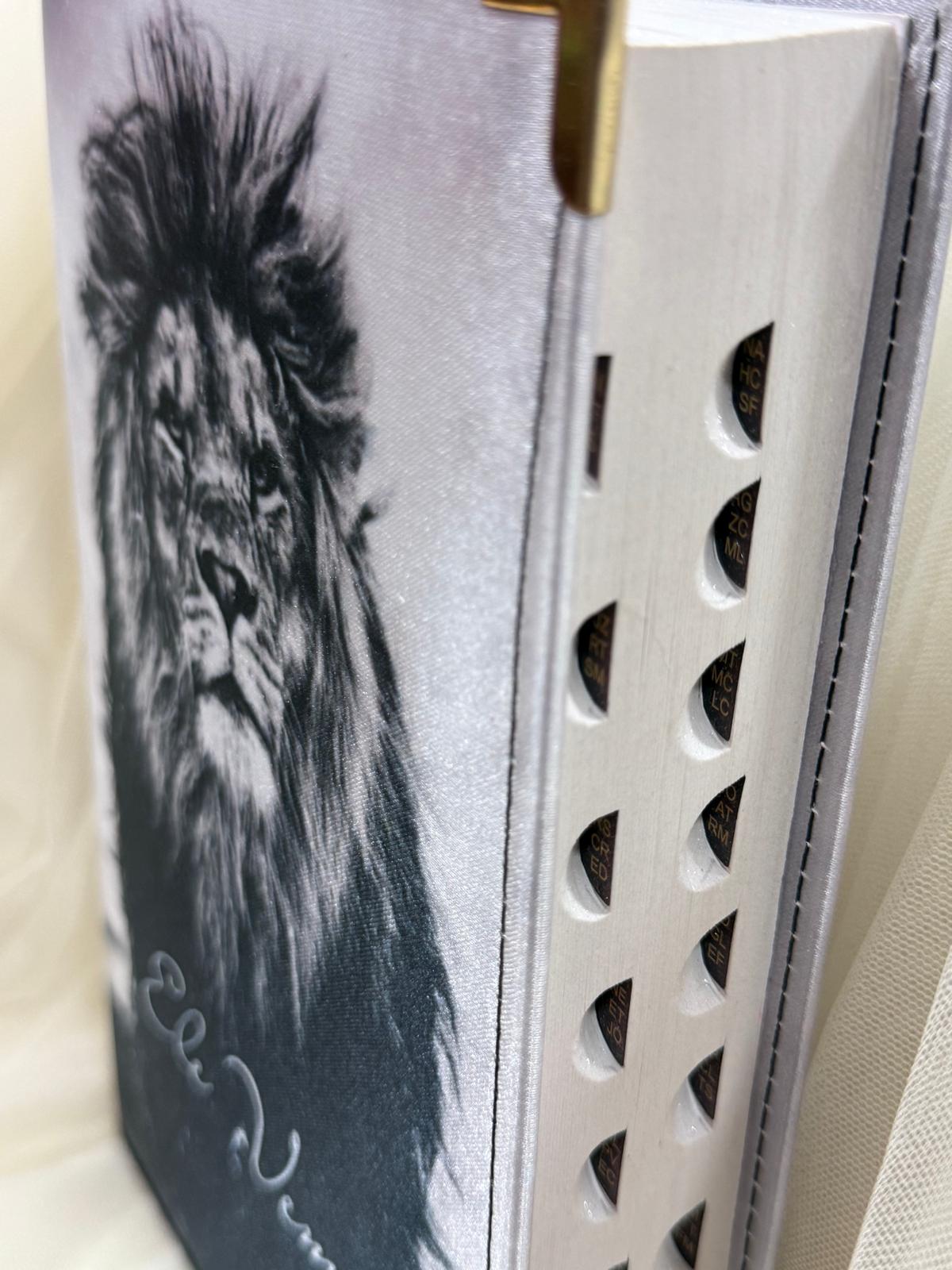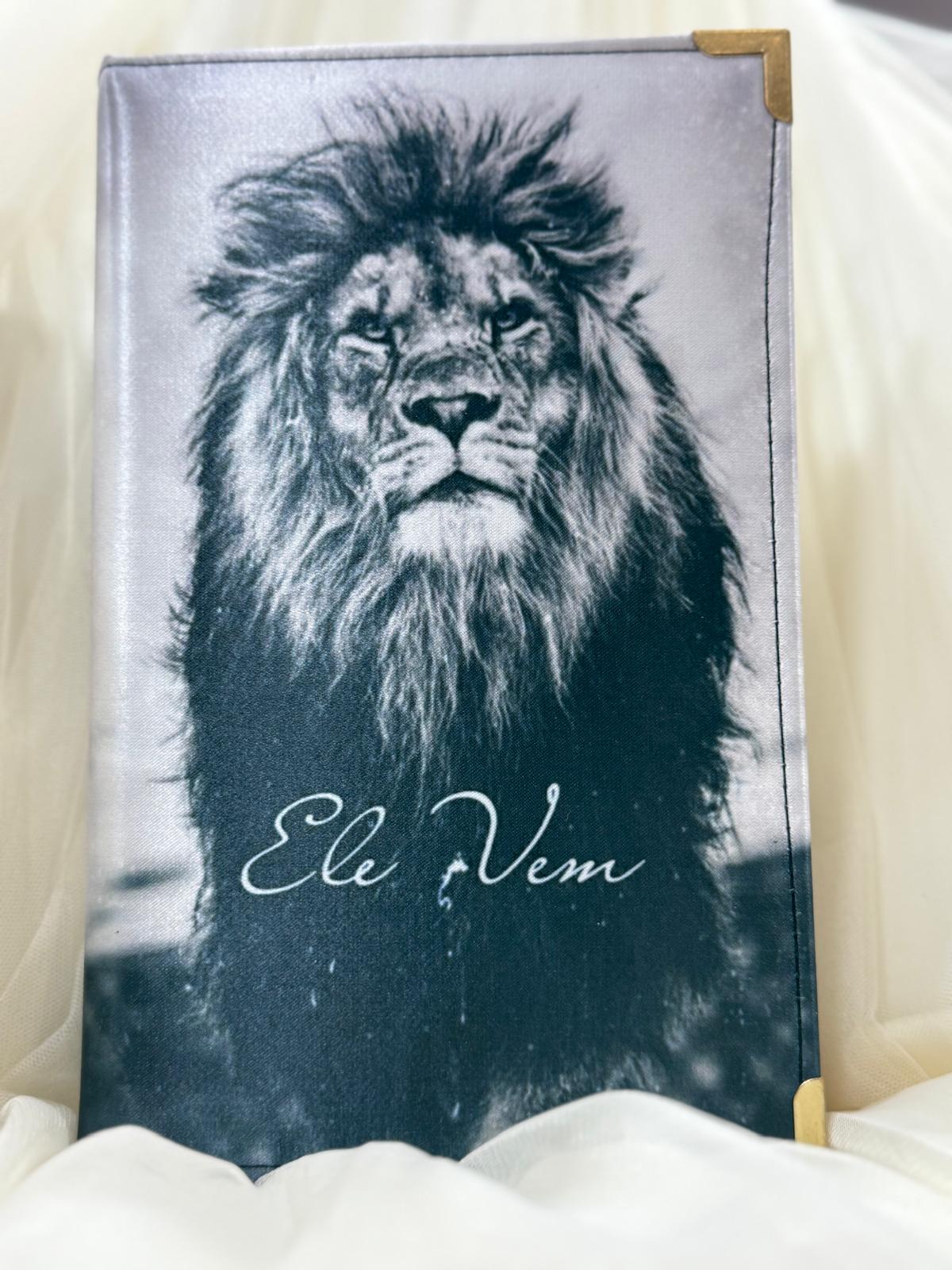 Esta Bíblia apresenta uma verdadeira declaração de fé! A poderosa imagem do Leão em tons de preto e branco simboliza a força, a realeza e a soberania de Cristo. A mensagem “Ele Vem” é um lembrete constante da nossa esperança na Segunda Vinda, tornando este exemplar não apenas um livro, mas uma peça devocional.