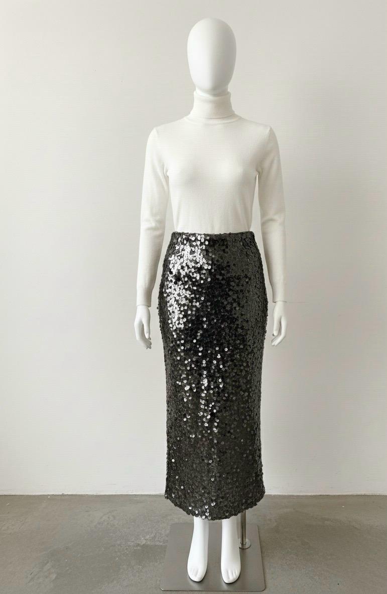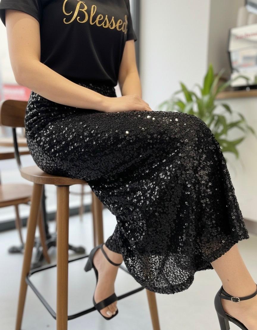 A Saia Midi de Lantejoulas Preta é a peça definitiva para quem busca um visual único, elegante e atemporal. Combinando o mistério do preto com o brilho magnético dos paetês, esta saia transforma qualquer produção básica em um look de estrela.