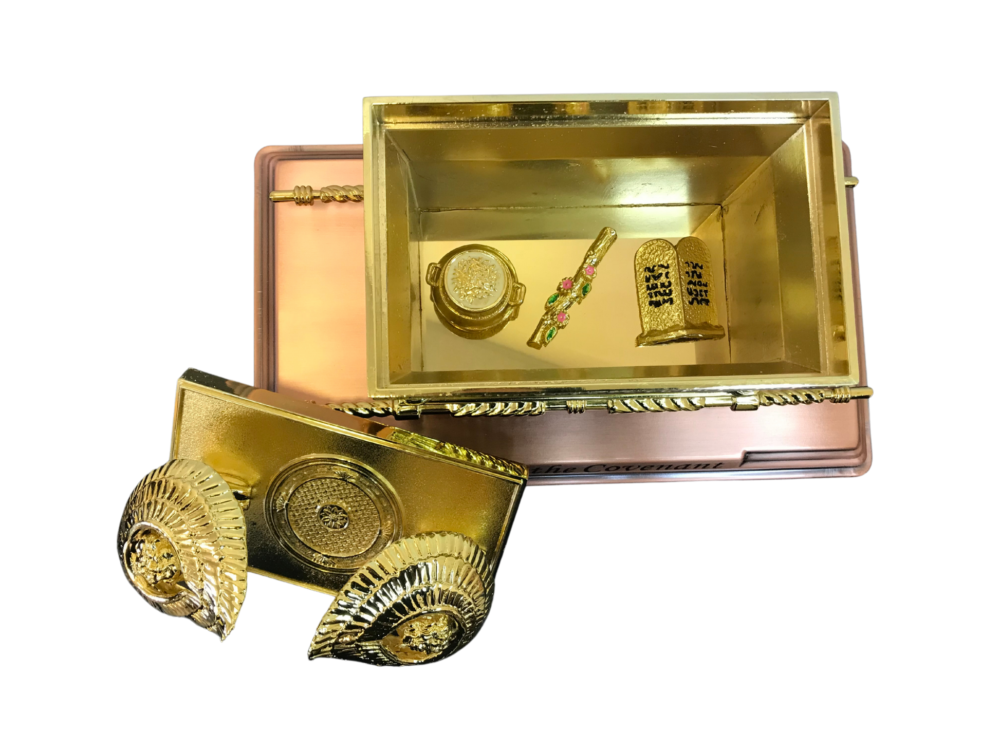 A arca repousa sobre uma base de cobre robusta, que complementa o brilho dourado e garante estabilidade à peça. No seu interior, você encontrará os três conteúdos sagrados que a acompanham na narrativa bíblica: