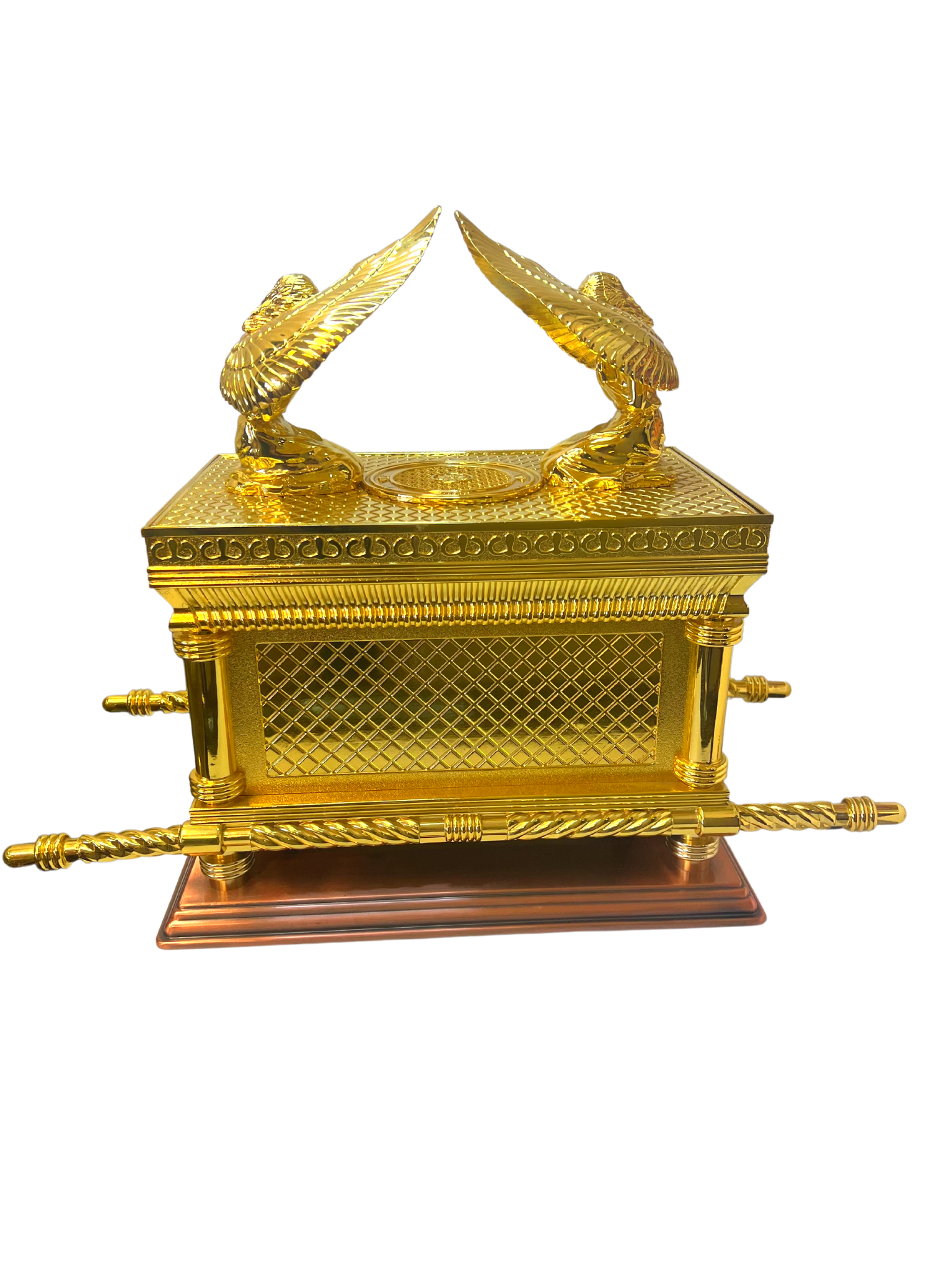 Esta deslumbrante réplica da Arca da Aliança é mais do que um simples objeto decorativo; é um símbolo de fé e uma representação fiel de um dos mais sagrados artefatos bíblicos. Fabricada com um metal banhado a ouro de liga de zinco, a arca exibe um acabamento excelente que realça cada detalhe, capturando a majestade do original.