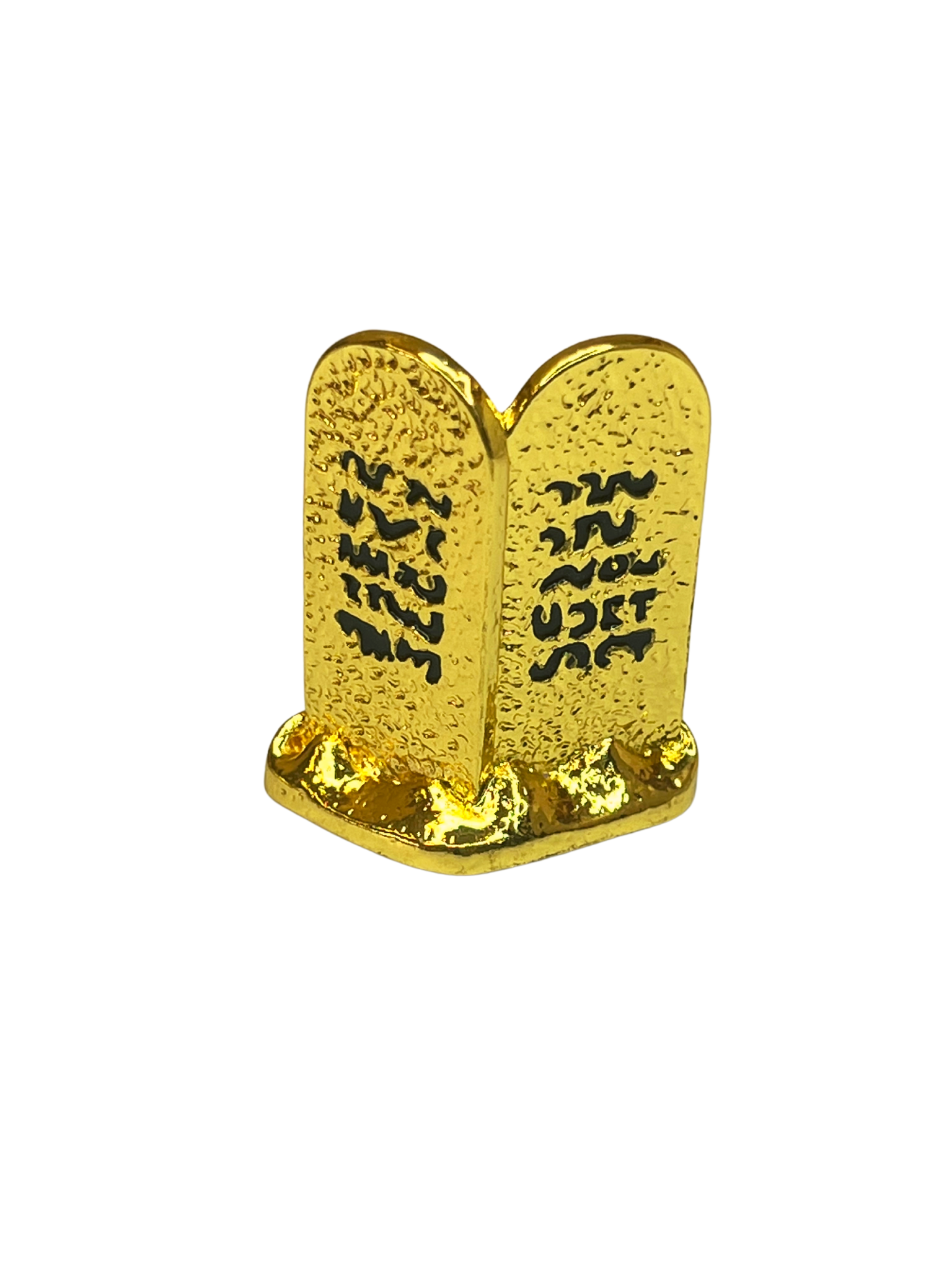 Duas pequenas tábuas na cor dourada, gravadas com caracteres que se assemelham ao hebraico.