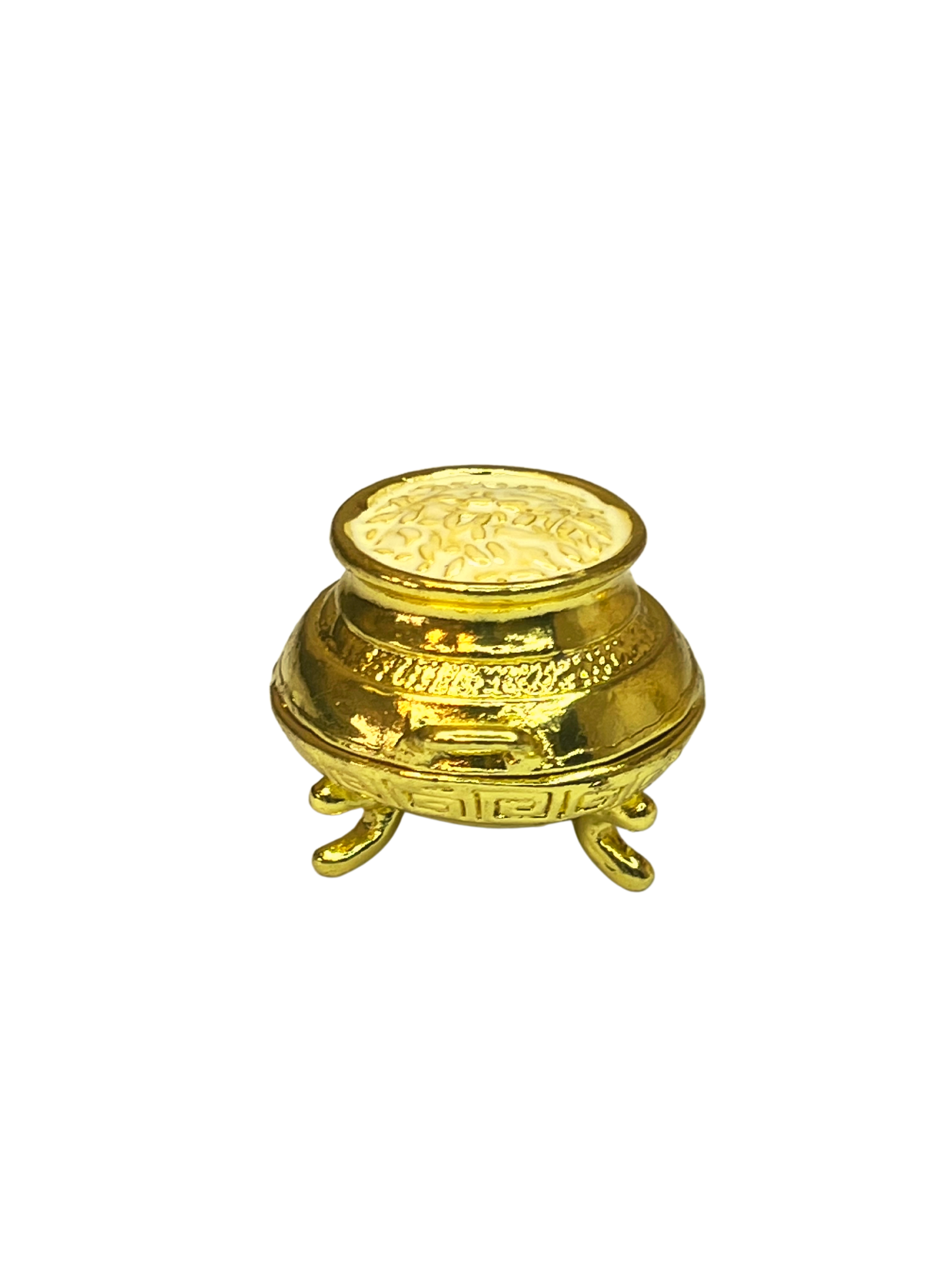Um pequeno recipiente redondo e dourado, com uma cobertura branca que representa o maná.