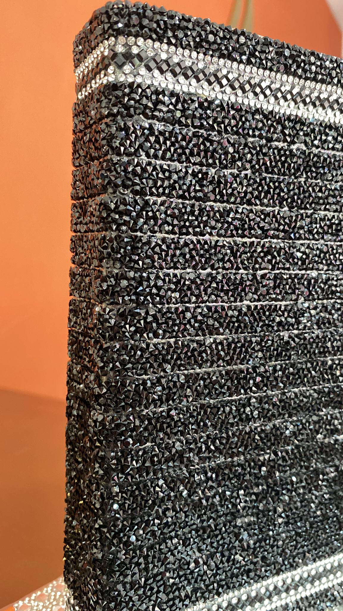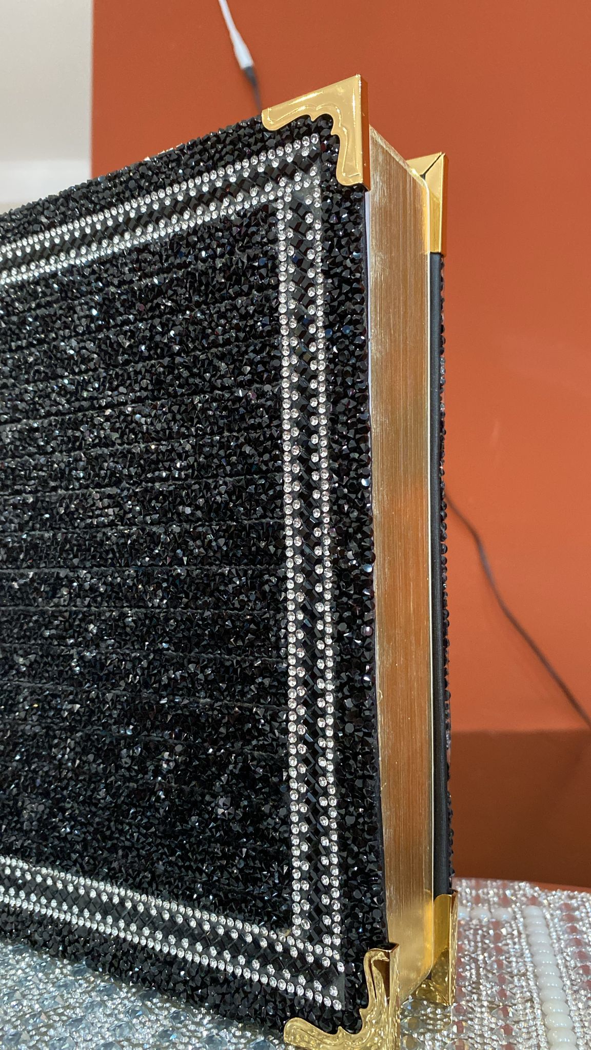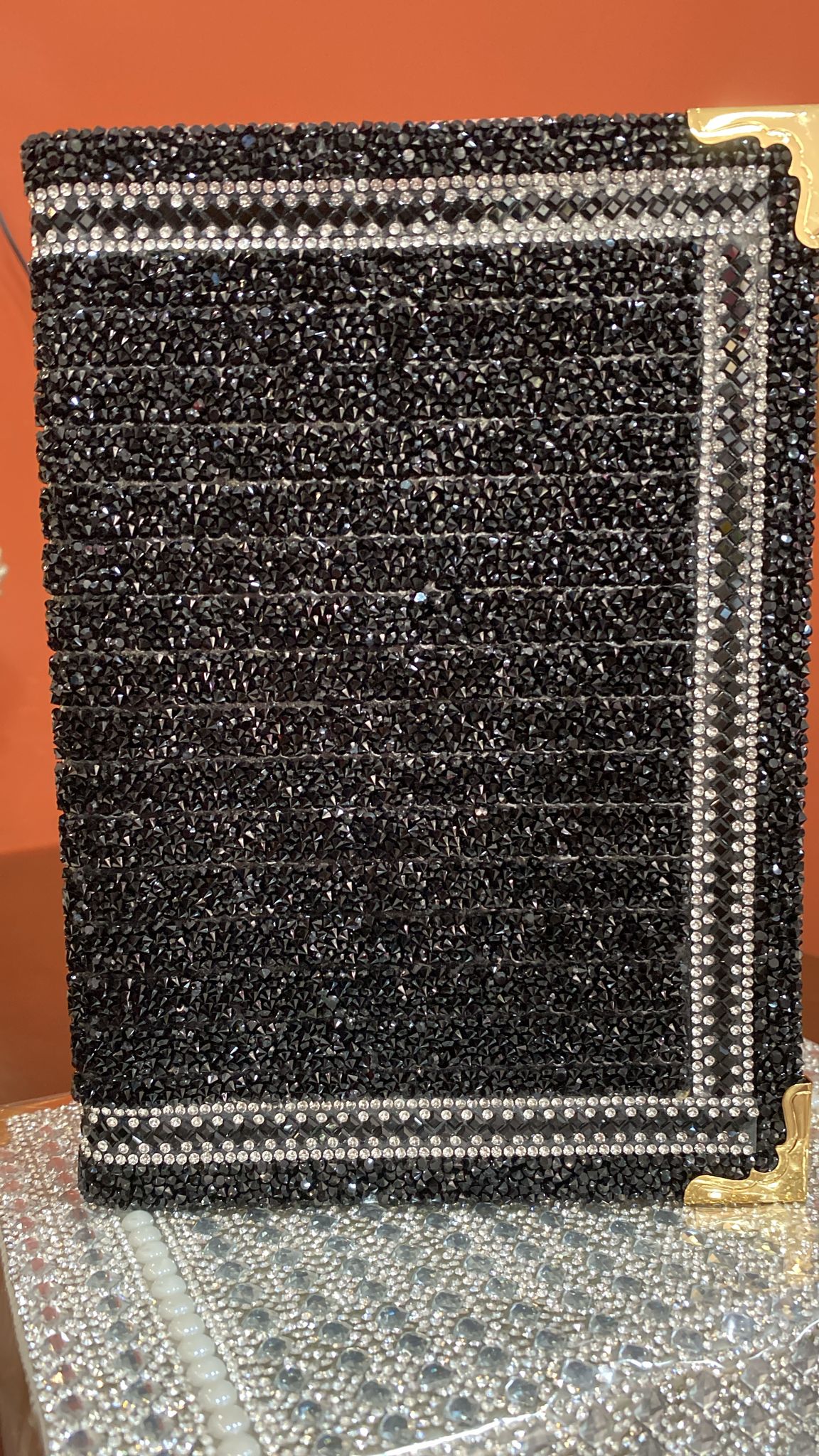 Brilhante: A capa é coberta por uma camada densa de strass ou cristais pretos/grafite, que cria um efeito cintilante e sofisticado, lembrando a textura de um tecido cravejado de pedras.