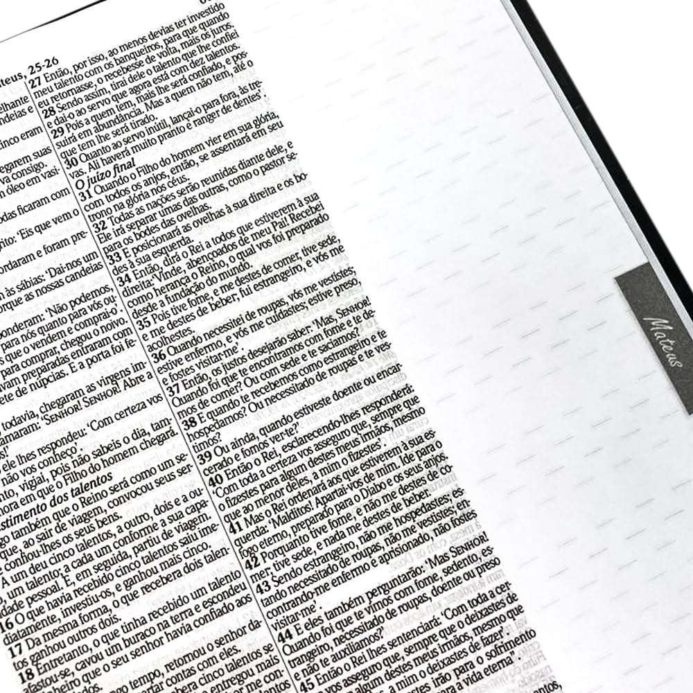 Bíblia King James Atualizada Com Espaço Para Anotações Leão Rei Dos Reis Bíblia KJA, você tem toda a confiança de estar lendo os textos bíblicos sagrados mais próximos de seus autores originais, épocas e culturas, e os manuscritos bíblicos mais reconhecidos pelas academias linguísticas em todo o mundo. A Bíblia King James Atualizada (KJA) é a única tradução - que mantém o estilo do rei James I e de seu amigo William Shakespeare de 1611 – mas considerou o texto Crítico ao lado dos textos Massoréticos e Receptus, dos grandes Códices e dos Rolos do Mar descobertos nas cavernas do monte Qumran. A Bíblia King James possui uma das traduções mais próximas do original, pois foi trabalhada por mais de cinquenta biblistas e eruditos da Grã-Bretanha, sendo organizada e sob a instrução do príncipe que era protestante e tinha alto conhecimento linguístico. Com a Bíblia King James Atualizada Com Pautas Para Anotações, tudo aquilo que Deus falar ao seu coração pode ser anotado no mesmo instante da leitura, formando um arquivo de experiências espirituais que estará à disposição para sempre, ou seja, da mesma forma que você terá acesso às Escrituras Sagradas também terá a opção de consultar seus comentários, anotações e orações ao lado da própria Bíblia. Sobre a Bible Journaling: A Bible Journaling é uma técnica originada nos Estados Unidos e tem conquistado muitos adeptos no Brasil. É uma maneira artística de meditar na palavra de Deus e de se conectar com as Escrituras, pois quando você escreve, pinta ou desenha um determinado texto da Bíblia, você também medita sobre os versículos e no que o Senhor está ensinando. Não existe um jeito certo ou errado de fazer a Bible Journaling, não um projeto rígido, é seu momento de expressão artística e o que você coloca nas páginas é pessoal entre você e Deus.