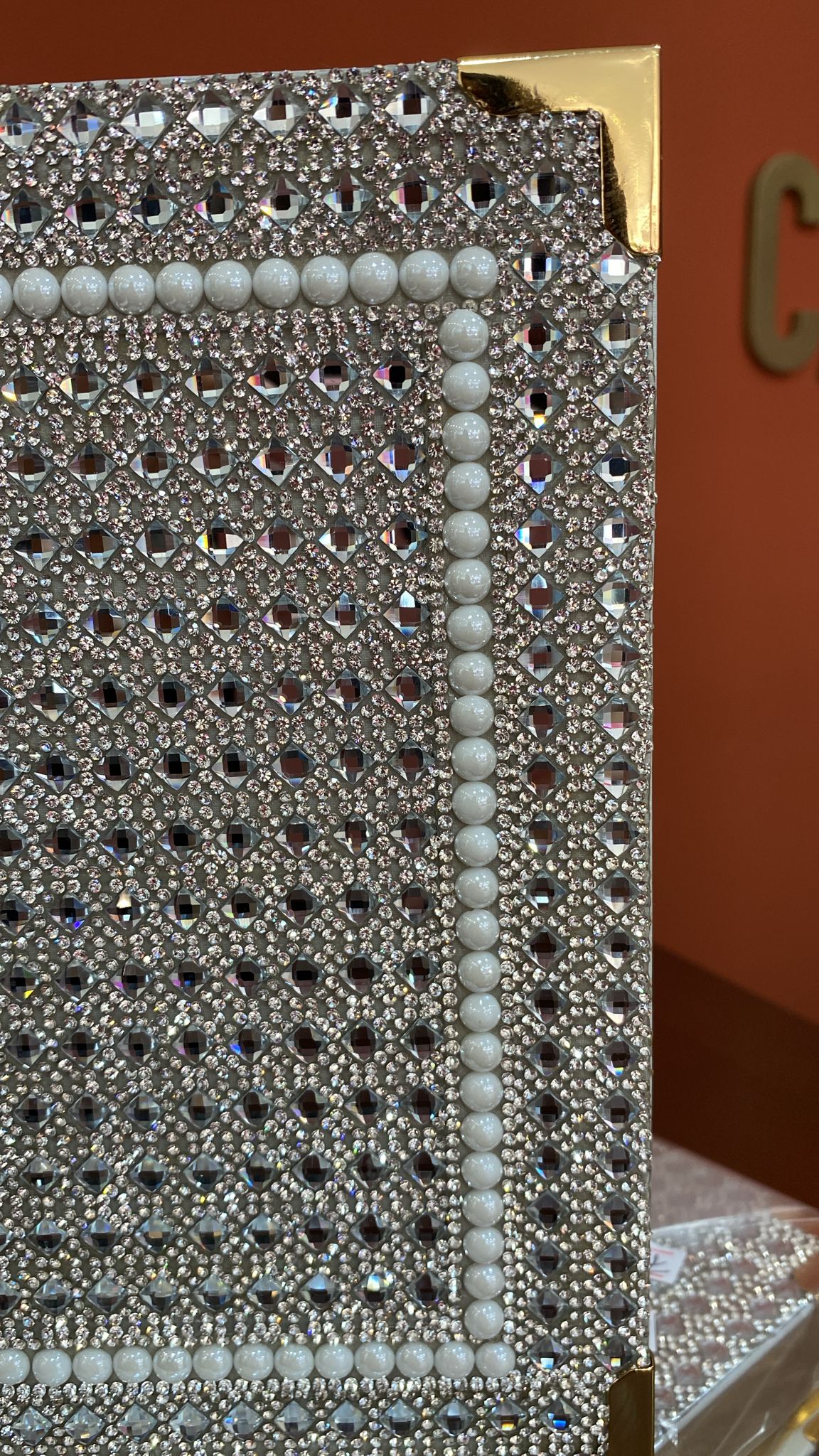 Detalhes em Pérolas: O design é emoldurado por fileiras de pérolas brancas ou peroladas, dispostas em uma linha reta na parte superior, inferior e na lateral, criando um contraste elegante com o brilho dos strass.