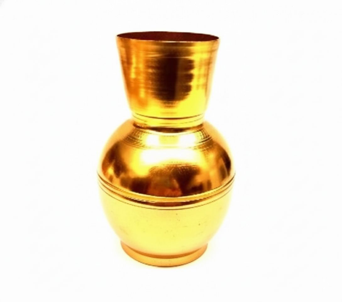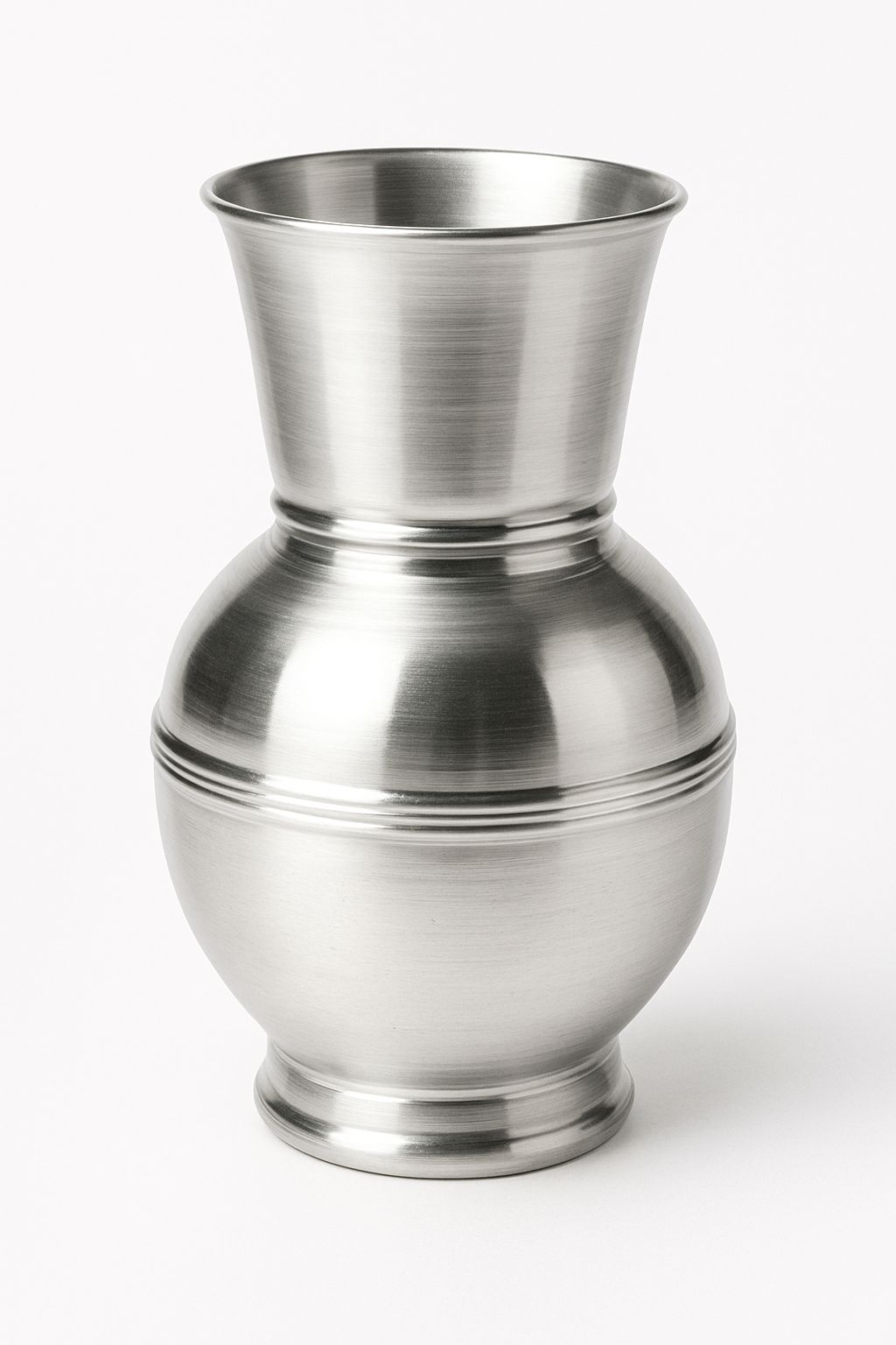 Design e Material: O utensílio apresenta uma forma clássica de jarra. O corpo inferior é esférico e robusto, conferindo estabilidade, e é separado por uma faixa horizontal proeminente. A parte superior afunila-se em um pescoço elegante que se abre para uma boca larga, facilitando o enchimento e, dependendo da prática da igreja, o serviço ou imersão do pão. O material metálico e a cor transmitem uma sensação de dignidade, reverência e valor, adequados para um item central da liturgia.